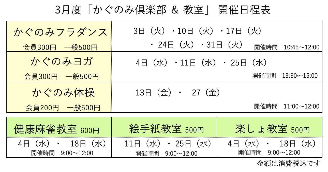 かぐのみ倶楽部&教室 開催日程表